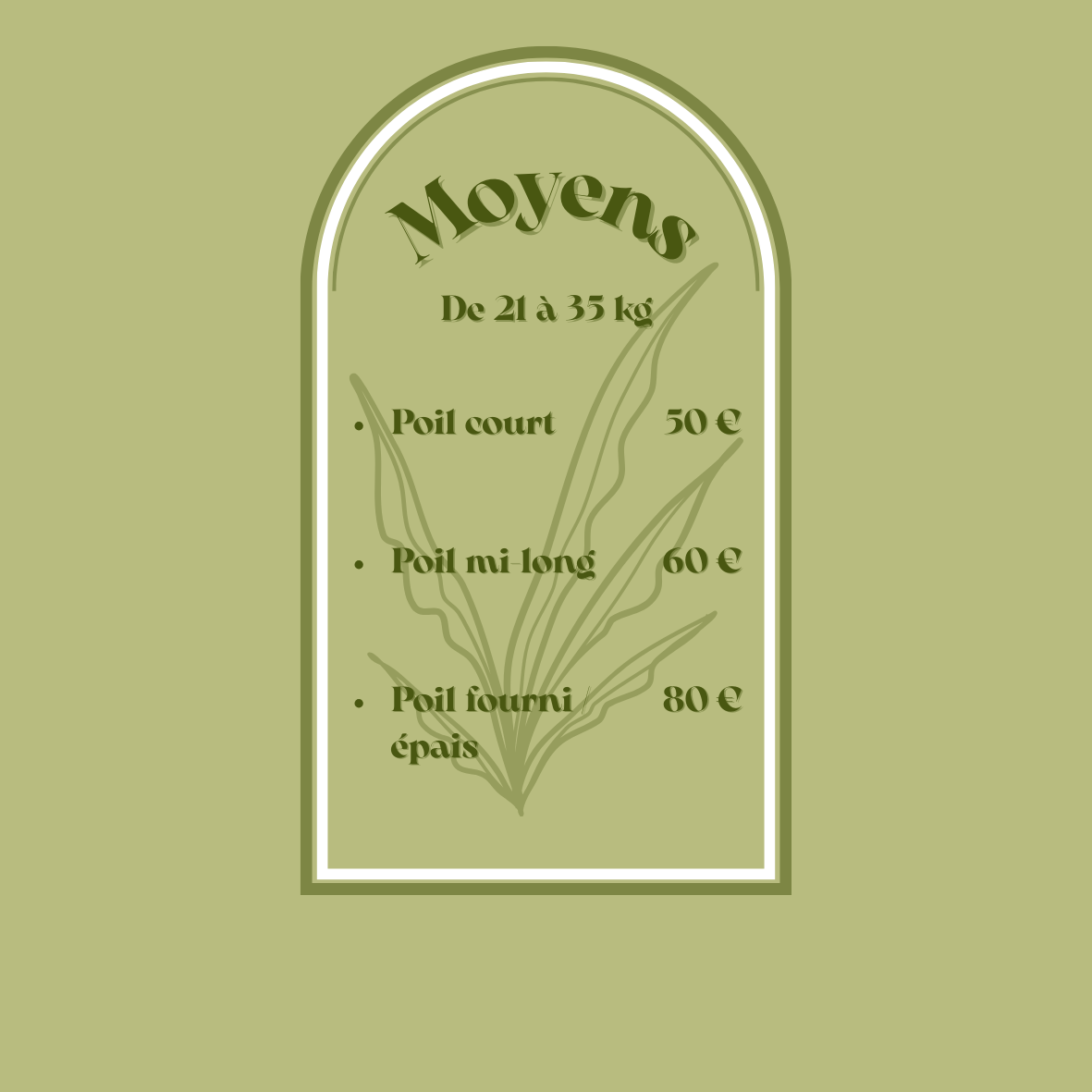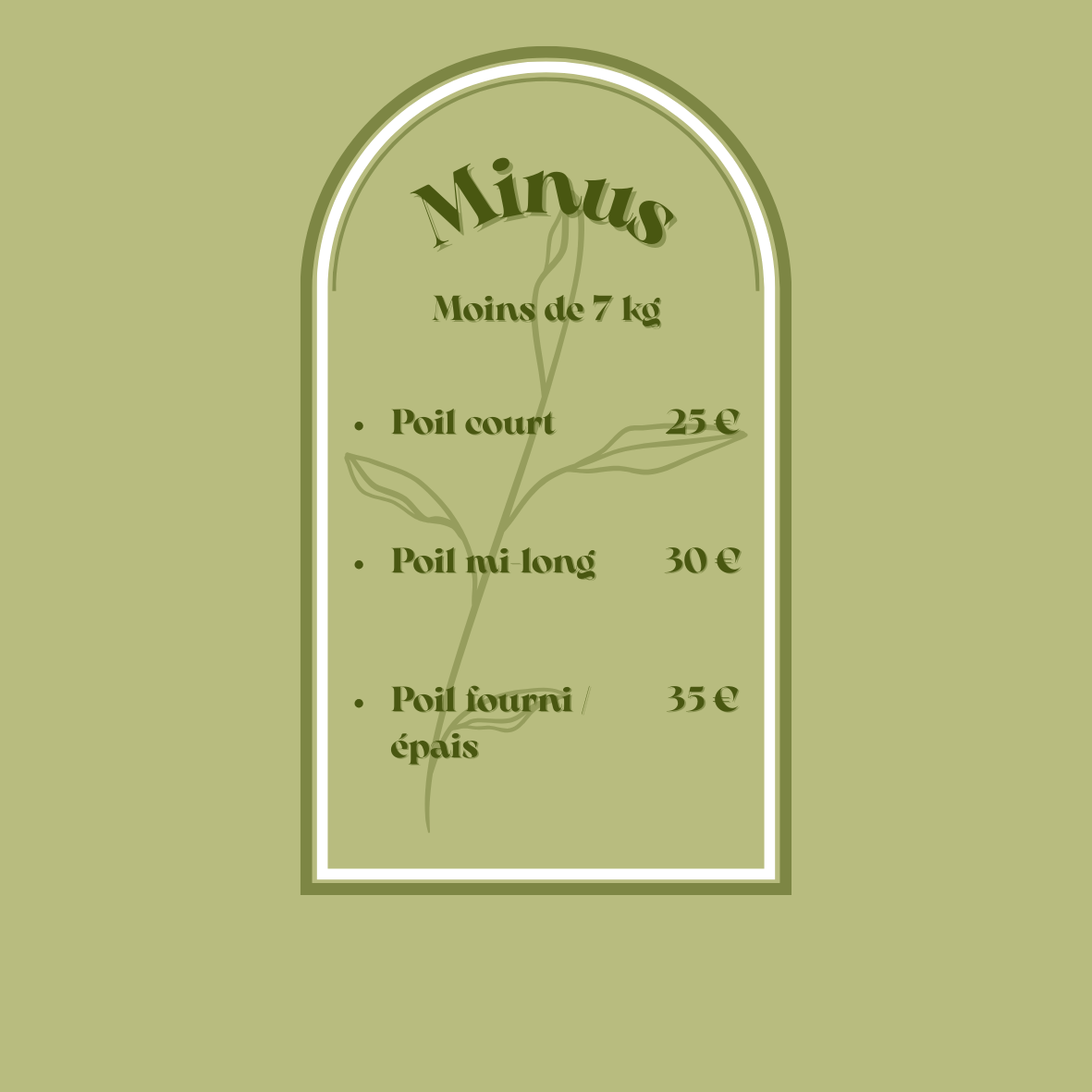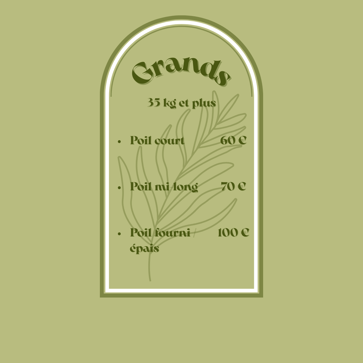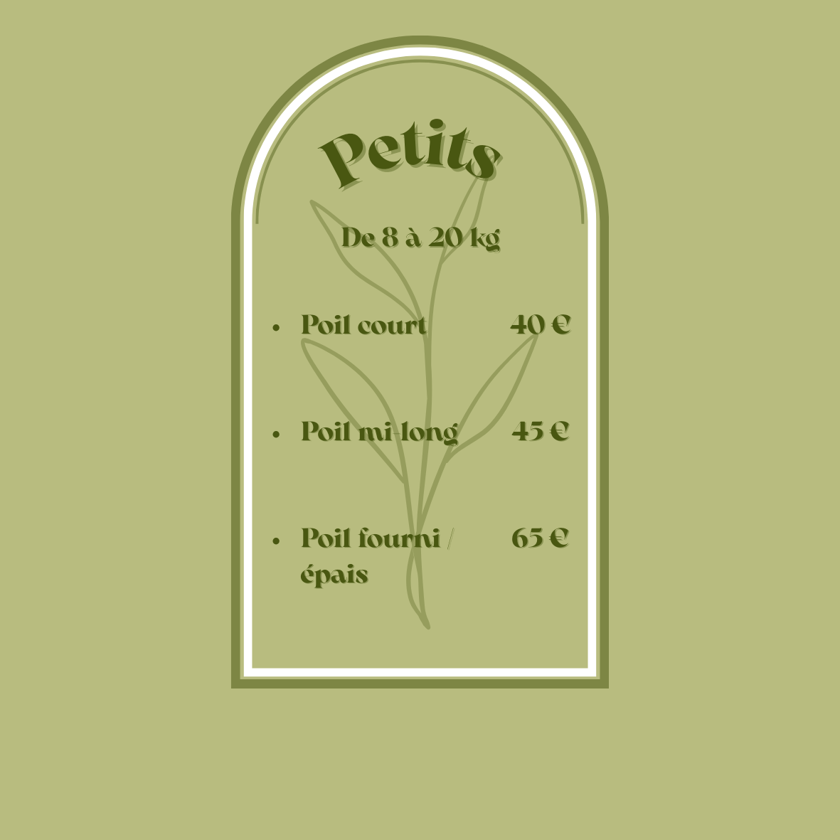 Les tarifs ci-dessous correspondent à une prestation bain + démêlage. Un supplément est demandé en cas de demande de toilettage technique (tonte, épilation, coupe ciseaux)